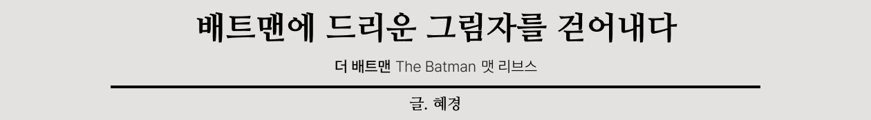 <λ λ°°νΈλ§¨>μ λ°°νΈλ§¨μ μ΄λμ΄ κ·Έλ¦Όμλ₯Ό κ±·μ΄λ΄λ μ¬μ μ΄λ€. λ°λ³΅λλ κ·Έλ λ°€μ κΈ°μ΅κ³Ό λμμμ΄ μμμ€λ₯΄λ 볡μμ¬μΌλ‘ μ΄λμ΄ κ·Έλ¦Όμκ° λμλ λ°°νΈλ§¨. λΈλ£¨μ€ μ¨μΈμ μΆμ μκ³ μ΄λ λ°°νΈλ§¨μ μ΄μ 볡μκ° μλ ν¬λ§μ κΏκΎΌλ€. κ·Έμ κ³μ μμ€ν μ¬λλ μκ³ , μλ‘μ΄ ν¬λ§μ΄ λ μ²λ ΄ν μμ₯ λ²¨λΌ λ μλ μλ€.