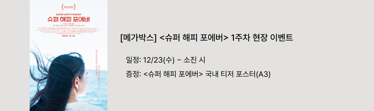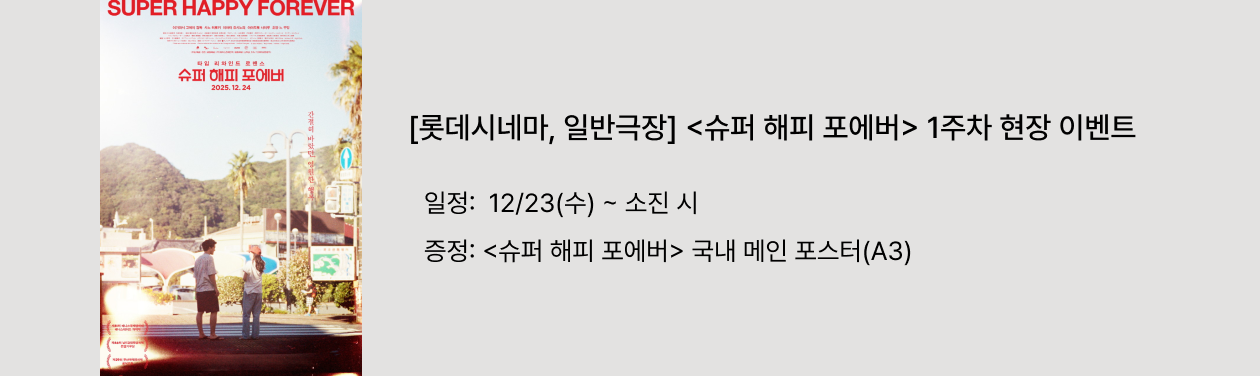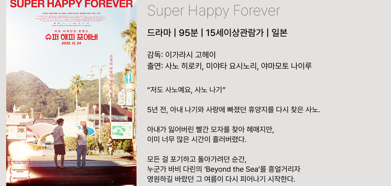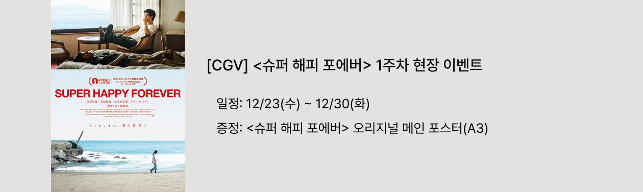 님에게 ‘순간’과 ‘영원’은 어떤 감각으로 마음에 새겨져 있나요? 이미 지나간 시간이지만, 여전히 선명하게 남아 있는 님의 일상 속 ‘영원히 남은 순간’을 떠올려보시면서 오늘의 뉴스레터 만나보면 좋을 것 같습니다. <슈퍼 해피 포에버>는 바로 오늘부터 12/24(수)부터 극장에서 만나볼 수 있습니다.