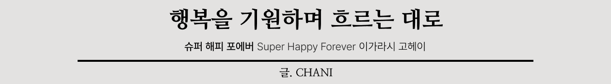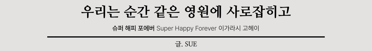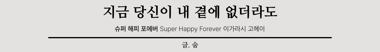 여느 연애와 사랑이 그렇듯 함께하는 순간이 멈추지 않고 영원히 행복했으면 좋겠다 싶다가도 서로를 헐뜯고 이해할 수 없어 걷잡을 수 없이 미워지기도 한다. 사노와 나기에게도 그런 시간이 있었을까. 그래서 더, 그녀에게 반했던 순간과 공간이 그리워 나기가 부르던 노래를 부르고 걷던 모래사장을 걷는 건지도. 상실의 아픔을 대하는 자세에 정답은 없다. 찰나의 순간에 마음을 사로잡혀 영원을 약속하고 그 약속을 평생 후회하기도 하는 게 인간의 감정. 슈퍼 해피 포에버. 결국 우리를 살게 하는 건 영원할 것 같던 고통이 아니라, 찰나에 머물렀던 행복의 기억일지도 모른다.