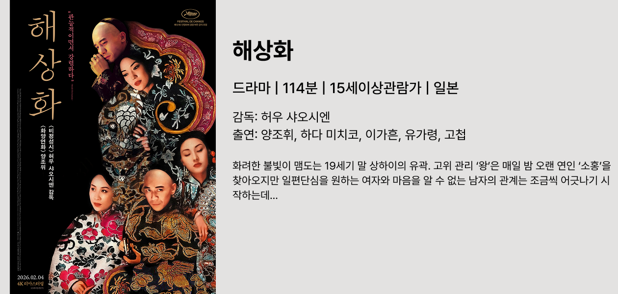 🎥 Editor's Pick | ''사랑'이란 무엇일까?' 19세기 말에도, 그리고 지금에도 여전히 유효한 질문을 던지는 작품이라는 생각이 들어요. 이번 주(2/4)에 개봉하였으니, 꼭 극장에서 만나보면 좋을 것 같습니다. 허우 샤오시엔 감독의 아름다움 미장센과 양조위 배우, 그리고 눈부신 중화권 스타들의 모습을 꼭 스크린 가득 보는걸 추천드려요! |