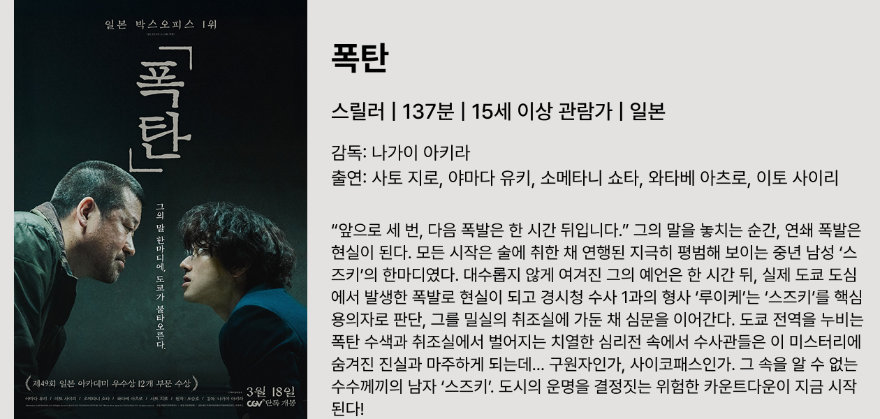 🎥 Editor's Pick | 이번 아카데미 시상식에서 국제장편영화상을 수상한 작품이죠. 가족 간의 갈등과 이해를 ‘집’이라는 공간을 통해 섬세하게 풀어내며 깊은 감동을 전하는 영화입니다. 지구 반대편 노르웨이의 가족 이야기지만 그 안의 담긴 개인의 고민과 공유하고 있는 감정은 지극히 보편적이라는 생각이 들어요. 아직 극장에서 만나볼 수 있으니 혹시 아직 안보셨다면.. 극장으로 달려가세요! |